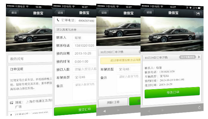 微汽車采用微信寶平臺進行汽車的銷售管理、預(yù)約保養(yǎng)、預(yù)約試駕、保險計算、車貸計算、車型比較、違章查詢、360度全景看車、車主關(guān)懷等功能,整個過程非常便捷,省時省力省心,并通過與微信平臺有交互能力的手機客戶端,快速便捷的實現(xiàn)了商家的銷售管理與預(yù)約過程,同時也實現(xiàn)了客戶無需進入4s店就能進行預(yù)約保養(yǎng)和試駕的功能。