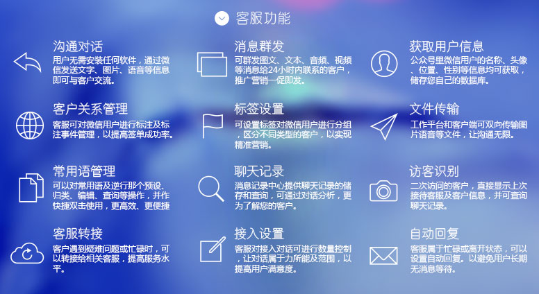 隨著互聯(lián)網(wǎng)的發(fā)展及網(wǎng)絡(luò)營銷模式重要性的凸顯,在線客服系統(tǒng) 會成為網(wǎng)絡(luò)營銷的重要工具,也是提示企業(yè)形象、加強企業(yè)與訪 客互動的必備工具;如今,微信迅速崛起,商家都把店鋪搬進了 公眾賬號,而微信微客服系統(tǒng),就是一款為微信商家打造的實時 溝通軟件,讓商家可以分享微信6億用戶,創(chuàng)造無限商機。