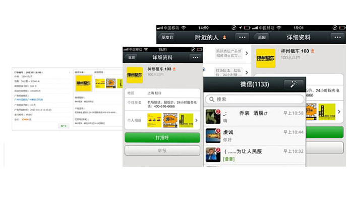 Location Surround Push(基于附近的人的消息推送)微信中基于LBS(基于位置的服務(wù))的功能插件“查看附近的人”便可以使更多陌生人看到這種強制性廣告。 用戶點擊“查看附近的人”后,可以根據(jù)自己的地理位置查找到周圍的微信用戶。在這些附近的微信用戶中,除了顯示用戶姓名等基本信息外,還會顯示用戶簽名檔的內(nèi)容。所以用戶可以利用這個免費的廣告位為自己的產(chǎn)品打廣告。 營銷人員在人流最旺盛的地方后臺24小時運行微信,如果“查看附近的人”使用者足夠多,這個廣告效果也會不斷隨著微信用戶數(shù)量的上升,可能這個簡單的簽名欄也會變成會移動的“黃金廣告位”。